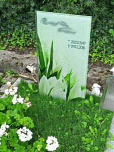 Glasgrabsteine sind eine moderne Wahl, die Transparenz und Leichtigkeit vermitteln. Sie können in verschiedenen Farben und Formen hergestellt werden und ermöglichen eine individuelle Gestaltung. Glasgrabsteine können auch mit Lasergravuren verziert werden, um ein personalisiertes Design zu schaffen. |