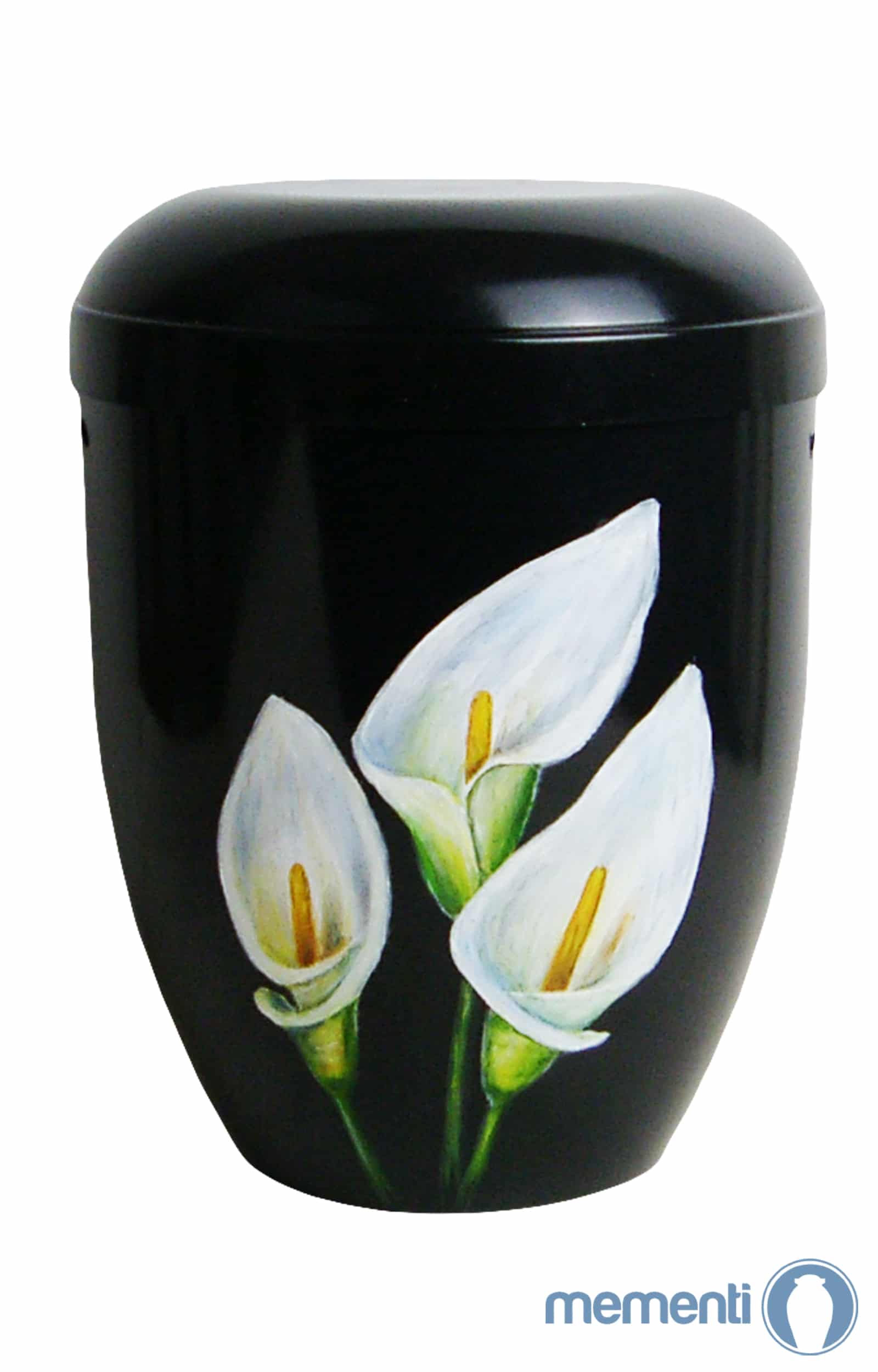 Bio Urne handbemalt mit der Calla Blume: Sie symbolisiert Unsterblichkeit und ein Leben nach dem Tod.