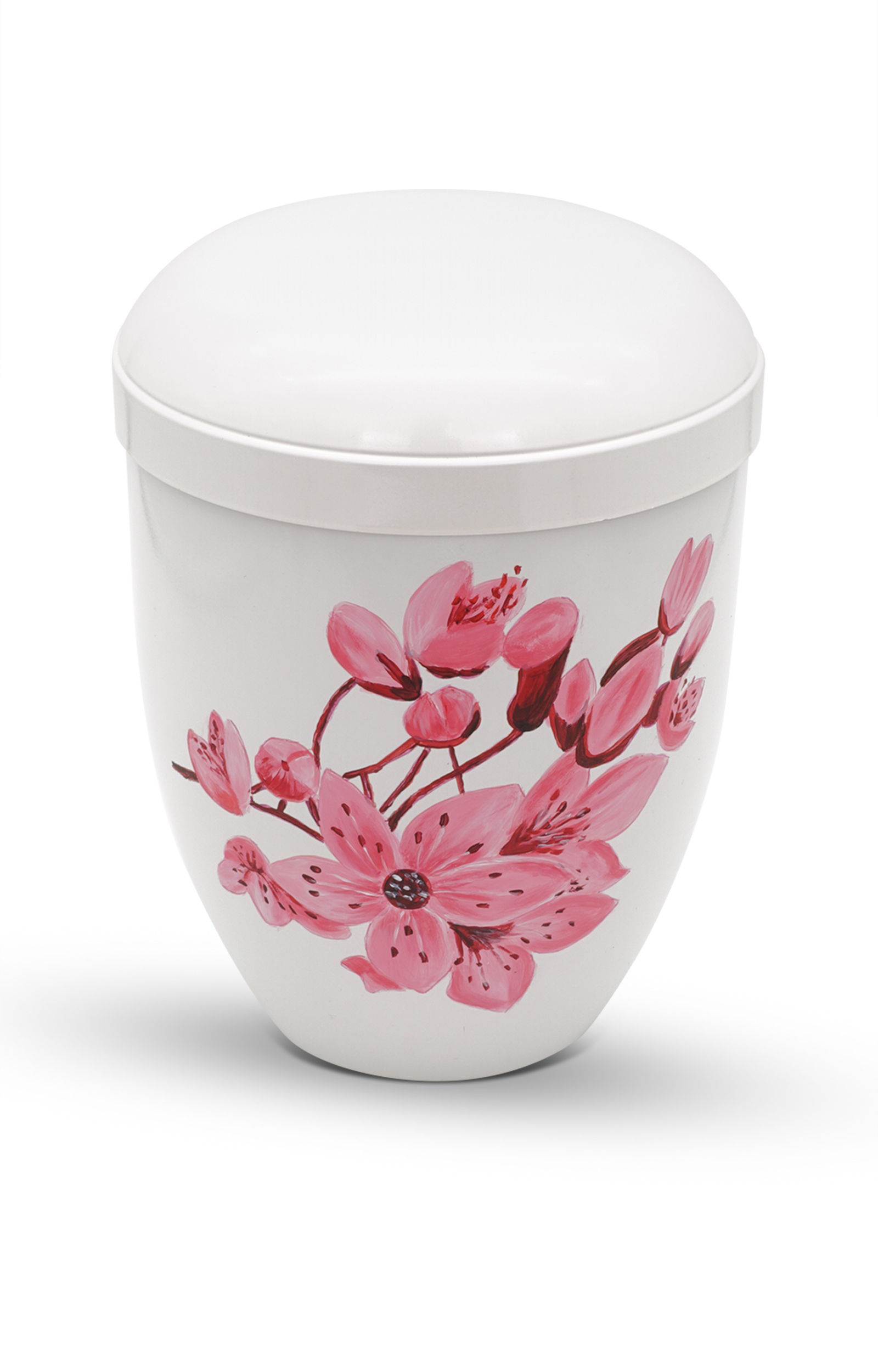 Die Bio Urne „Blüte des Abschieds“ vereint zarte Schönheit mit tiefer Symbolkraft. Auf dem strahlend weißen Hintergrund entfaltet sich in feiner Handmalerei ein Blütenzweig in sattem Rosé – inspiriert von der Kirschblüte, die für Vergänglichkeit und Neuanfang steht. Diese Urne ist eine poetische Hommage an das Leben, das in liebevoller Erinnerung weiterblüht.