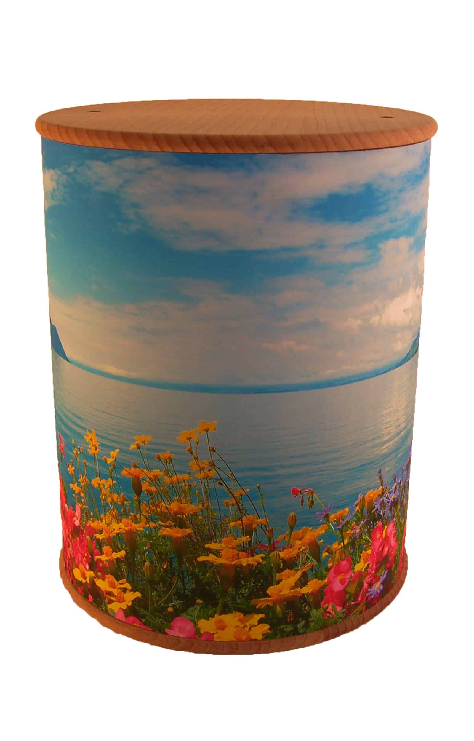 Sehr schöne, rundum bedruckte Biourne aus Holzstoff und Holzboden/Deckel mit Bumen am See.