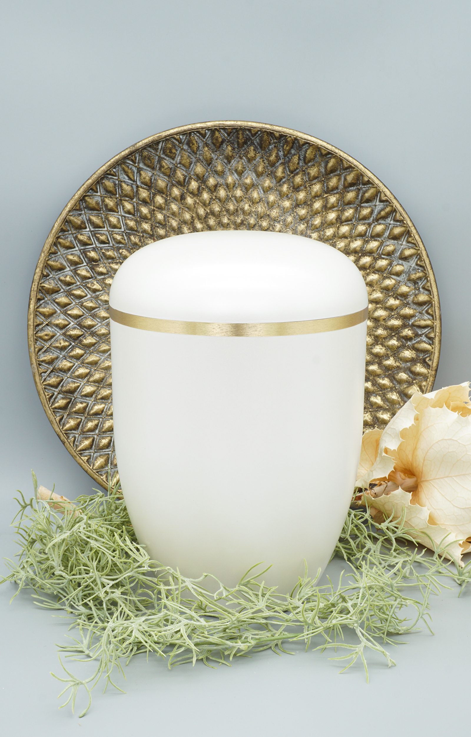Halten Sie das Andenken an Ihren geliebten Menschen in Ehren. Diese perlmuttfarbene Urne wurde in einer klassischen, leicht zu haltenden Form gefertigt; Außerdem ist sie aus biologisch abbaubaren Materialien, was bedeutet, dass sie sich zersetzt und die Asche der Erde zurückgegeben wird. Die Urne ist für die Einäscherung eines Erwachsenen geeignet, der die Natur geliebt hat.