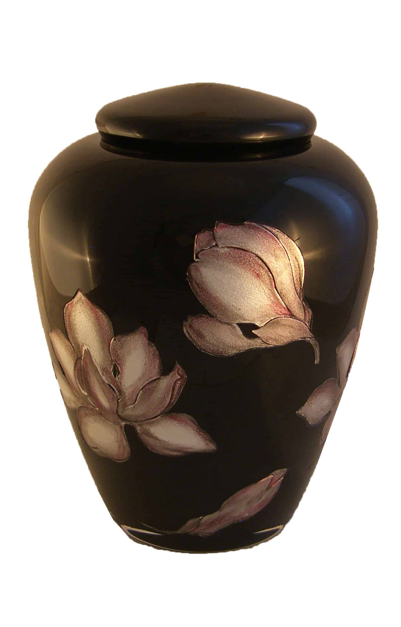 Diese wunderschöne Glasurne ist der perfekte Ort, um die Asche und Erinnerung an Ihre geliebte Person auf ewig zu bewahren. Der Korpus dieser Urne besitzt eine samtschwarze Farbe mit einem Blumenmuster, was Stärke und Eleganz ausstrahlt. Diese Urne ist für Asche von Erwachsenen geeignet.